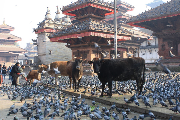 在加德滿都的市區裡,車子好多,喇叭聲總是不絕於耳,反正按喇叭不用交電費...計程車司機跟嘟嘟車司機總是不停的按著喇叭來交談,因為旅客多,服務業競爭大,人手一機手機,也不停的講手機。居民們也都很時髦,雖然穿的大都是山寨版的服飾,但是配色大膽也很時尚,而走入杜巴廣場內及附近的社區,加德滿都谷地有三個杜巴廣場,所謂杜巴廣場(Durbar Square)就是昔日宮殿所在,一直到20世紀初以前歷代君王都是住在這兒。這裡的建築大多是建於十七、十八世紀,都有三四百年歷史,當地的人民仍是如同百年前古人一樣在杜巴廣場生活、休憩、聚會聯絡,中午左右因為天氣正好,許多人就在汲水處旁洗頭洗澡,中午在加德滿都附近閒晃,一定可看到很多人在洗澡!(但我不好意思對著洗澡的人照相)